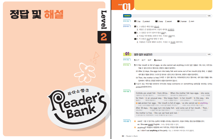 학습 방식도 독해와 문법이 따로 노는 것이 아니라, 지문 속에서 자연스럽게 연결되도록 짜여 있습니다. 먼저 Preview에서 핵심 단어와 문법 포인트를 가볍게 보고, 짧은 글과 긴 글을 읽으면서 새 표현을 실제 문장 속에서 확인하게 한 다음, 마지막 Grammar 파트에서 정리·연습을 하는 구조라서, 아이가 “문법을 따로 외운다”는 부담감보다는 “아까 읽었던 문장을 다시 확인한다”는 느낌으로 반복 학습을 할 수 있습니다. 본문 뒤에 실린 정답 및 해설에는 지문별 직독직해, 문장 해석, 문법·구문 설명, 정답 이유까지 자세히 들어 있어 채점 후에 꼭 함께 보도록 하면 좋습니다. 사실상 『리더스뱅크 Reader’s Bank Level 2 정답 및 해설』이 책 안에 함께 들어 있다고 보면 되고, 아이 혼자 공부할 때도 이 부분이 답지 역할을 제대로 해 줍니다.