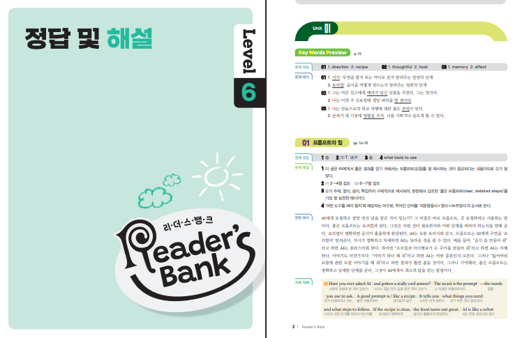 위 링크를 통해 Reader’s Bank Level 6 답지를 열람할 수 있습니다. 학습 방법은 한 번에 많은 Unit을 욕심내기보다, “하루 1개 Unit” 또는 “이틀에 1개 Unit” 정도로 정해서 루틴을 만드는 것이 좋습니다. 먼저 Key Words Preview를 보면서 모르는 단어에 표시를 하고, 세 지문을 읽을 때는 문제부터 보지 말고 내용을 천천히 이해한 다음에 문제를 푸는 연습을 하면 독해 속도와 정확도가 같이 올라갑니다. Review Test는 틀린 문제만 다시 보는 것이 아니라, 지문으로 돌아가 “왜 이 선택지가 정답인지, 근거 문장이 어디에 있는지”를 찾아보는 습관을 들이면 효과가 훨씬 커집니다.
