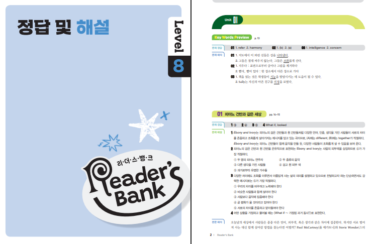 위 링크를 통해 Reader’s Bank Level 8 답지를 열람할 수 있습니다. 효율적으로 공부하려면 하루에 한 Unit씩, 또는 이틀에 한 Unit씩 꾸준히 정해진 분량을 반복하는 방법을 추천합니다. Key Words Preview에서 모르는 단어에 표시를 해 두고, 지문을 읽을 때는 해석에만 매달리기보다는 먼저 한국어로 내용을 정리해 보고, 그 다음에 문제를 풀어 보는 순서로 연습하면 독해 속도와 이해도가 함께 올라갑니다. 이때 해설지에는 각 문항의 정답뿐 아니라 지문 전문 해석, 문장별 직독직해, 문법·구문 설명이 담겨 있어 틀린 문제를 스스로 분석하기에 충분합니다.