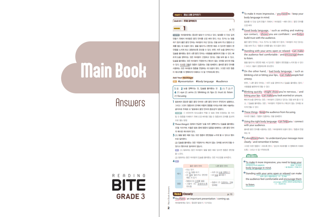이 교재의 핵심은 직독직해와 주어·동사 찾기를 통해 빠르고 정확하게 읽는 힘을 키우는 데 있습니다. 문장을 의미 단위로 끊어 읽는 연습을 꾸준히 하다 보면, 길어 보이는 지문도 겁먹지 않고 구조를 먼저 파악한 뒤 내용을 따라갈 수 있게 됩니다. 해당 시리즈는 일반적인 참고서처럼 정답과 해설 형식으로 제공되며 혼자 공부할 때는 반드시 채점 후 해설까지 꼼꼼히 읽어 보는 것을 권장합니다. 교육과정이 바뀌면서 최근에 새롭게 개정되었으므로 표지를 꼭 확인하시길 바랍니다. 본문에 리딩바이트3 답지 파일을 첨부해두었습니다.