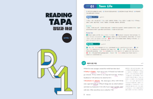 위 링크를 통해 리딩타파1 답지를 볼 수 있습니다. 또한, 이 교재는 학생들의 학습을 더욱 효과적으로 돕기 위해 워크북과 어휘 테스트, 쓰기 테스트, 독해 테스트 등을 제공합니다. 이를 통해 학생들은 자신이 학습한 내용을 반복적으로 확인하고, 부족한 부분을 보완할 수 있습니다. 각 유닛마다 학습을 시작하기 전에 ‘Before Reading’ 코너에서 구문을 사전 학습할 수 있어, 학생들이 독해 지문을 보다 잘 이해할 수 있도록 도와줍니다.