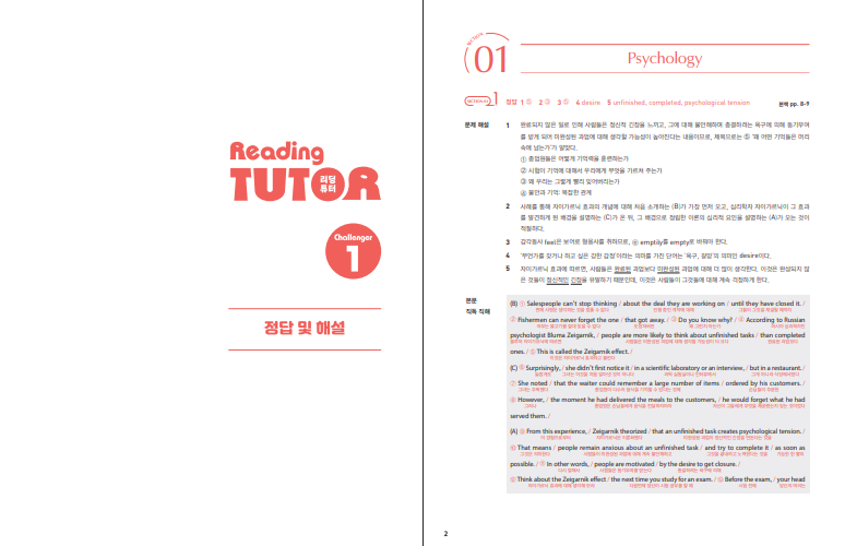 위 링크를 통해 reading tutor 챌린저1 답지를 열람할 수 있습니다. 이 교재는 정답과 해설이 친절하게 실려 있는 편이라 자습용으로도 무리가 없습니다. 리딩튜터 챌린저 1 정답 및 해설은 책 뒤쪽에 모두 수록되어 있고, 지문 해석과 구문 풀이가 같이 있어서 모르는 문장이 나와도 온전히 해석해 볼 수 있습니다. QR로 듣는 지문, 어휘 암기장, 워크시트도 제공되므로 더 많은 학습자료를 위해 홈페이지를 참고하시길 바랍니다.