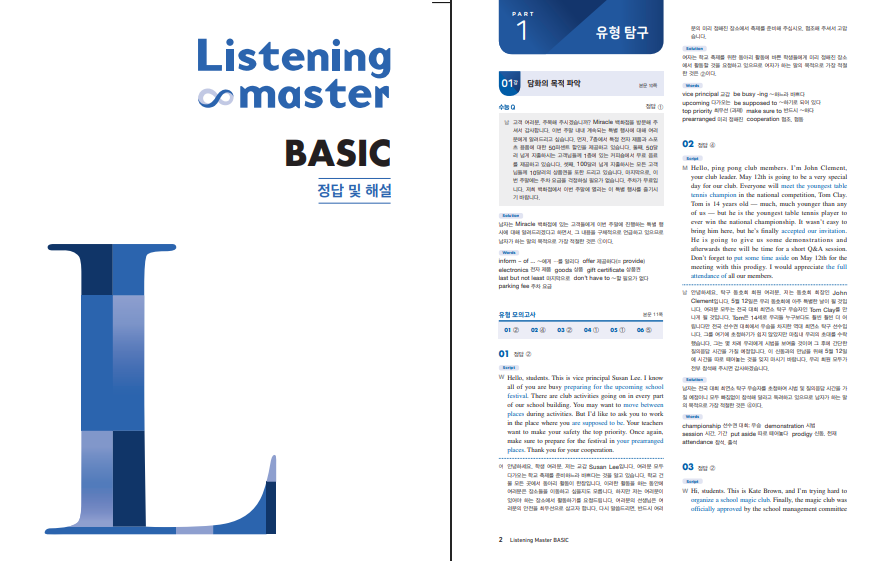 Listening Master 리스닝 마스터 BASIC은 고등 영어 듣기의 뼈대를 차근차근 세워 주는 입문·기본서입니다. 최신 수능과 모의평가, 학평의 기출 흐름을 분석해 실제 시험과 비슷한 느낌으로 연습할 수 있게 했습니다. 교재 안의 QR 코드로 음원을 바로 재생할 수 있고, 실제 시험과 동일한 속도는 물론 조금 빠른 1.2배속과 문항별 MP3까지 제공해 귀를 단계적으로 단련하기 좋습니다. 처음 고등 듣기를 시작하는 학생도 무엇을 어떻게 들어야 하는지 방향을 잡기 쉬운 구성이 강점입니다. 아래 리스닝 마스터 베이직 답지 PDF 를 올려두도록 하겠습니다. 표지를 꼭 확인하시길 바랍니다.