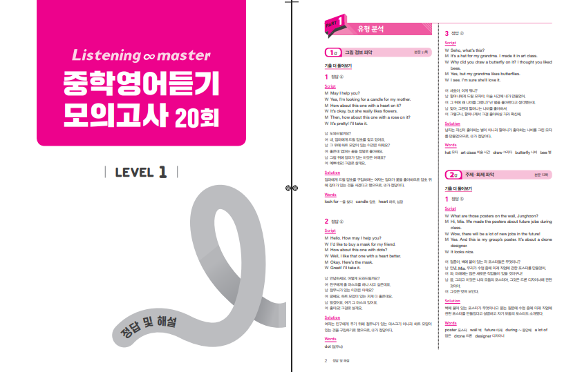 Listening Master 리스닝 마스터 중학 영어듣기 모의고사 20회 Level 1은 중1 수준에서 시·도 교육청 영어듣기평가를 실전처럼 대비하도록 만든 교재입니다. 듣기 유형의 기본기를 차근히 익히고, 바로 모의고사로 점검하는 흐름이라 처음 준비하는 학생도 학습 동선을 따라가기 쉽습니다. QR 코드로 음원을 바로 재생해 어디서든 연습할 수 있고, 주요 단어와 문장을 다시 듣고 써 보도록 설계되어 듣기와 받아쓰기를 함께 훈련할 수 있습니다. 아래 리스닝 마스터 중학영어듣기 모의고사 1 답지 PDF 파일을 올려두도록 하겠습니다. 표지를 꼭 확인하시길 바랍니다.