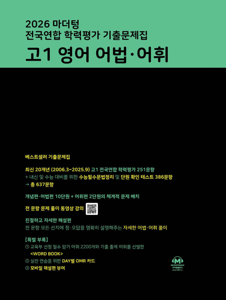 2026 마더텅 전국연합 학력평가 기출문제집 고1 영어 어법·어휘는 고1 수준에서 문장 구조와 필수 어휘를 함께 다지는 데 초점을 둔 교재입니다. 2006년 3월부터 2025년 9월까지의 전국연합 학평 251문항에, 내신과 수능 대비를 위한 어법·어휘 기본확인문제 386문항을 더해 총 637문항으로 구성되어 있습니다. 정답 해설은 모든 선지에 근거를 설명하는 방식이라 왜 맞고 틀렸는지를 한 번에 확인하기 쉽습니다. 그래서 수험생들과 고등학생 사이에서 마더텅은 필독서로 통하고 있습니다. 아래 마더텅 까만책 고1 영어 어법 어휘 답지를 올려두도록 하겠습니다.