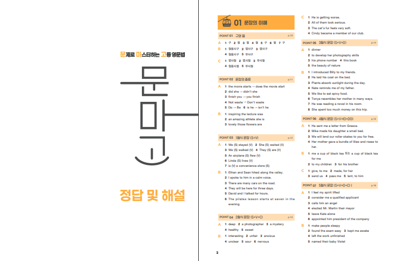 문마고(문제로 마스터하는 고등영문법) 개정판은 고등 문법 전 영역을 한 권에 압축한 교재입니다. 공개된 회원평가에서 높은 평점을 기록했으며, 리뷰에서는 핵심을 빠르게 정리하고 실전 감각을 끌어올리는 데 도움이 된다는 인상이 확인됩니다. 특히 예비 고등학생이 단기간에 문법 체계를 세우고자 할 때, 개념서와 문제집의 장점을 아우르는 구성이 강점으로 보입니다. 전개는 설명→주관식→Review Test의 흐름으로 이어지며, 처음 펼친 학습자도 학습 동선을 따라가기 쉽습니다. 아래 2025 개정 문마고 답지 pdf 파일을 올려두도록 하겠습니다. 표지를 꼭 확인하시길 바랍니다.