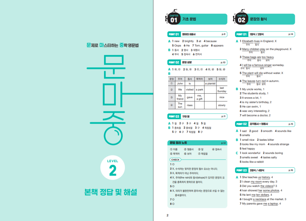 학습 범위는 기초 문법을 넘어 문장 형식(1~5형식, 사역·지각동사), 시제와 현재완료, 다양한 대명사 용법, 조동사, to부정사·동명사, 비교 구문, 수동태, 등위·종속·상관접속사, 분사와 분사구문, 관계사(주격·목적격·소유격, what·that 구별), 가정법, 시제의 일치와 화법 전환까지 내신에 자주 출제되는 영역을 폭넓게 아우릅니다. 항목별 예문이 간결하고 틀리기 쉬운 지점을 대비·대조로 잡아 주어 오개념 교정에 효과적입니다. 아래 링크를 통해 문마중 레벨2 답지를 열람할 수 있습니다. 홈페이지를 통해 학습자료를 또 확인할 수 있습니다.