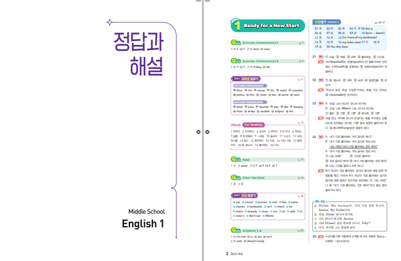 이 자습서는 교과서를 따로 펼치지 않아도 될 만큼 해설이 자세하게 구성되어 있다는 점이 특징입니다. 본문 해석과 문법 설명, 예시 답안이 함께 제시되어 있어 수업 시간에 이해하지 못했던 부분을 집에서 다시 정리하기 좋습니다. 또한 영역별 핵심 내용을 한눈에 확인할 수 있어, 듣기·말하기·읽기·쓰기에서 무엇을 중점적으로 봐야 하는지 알기 쉽습니다. 영어가 아직 낯선 학생도 부담 없이 따라갈 수 있도록 구성되어 있습니다.