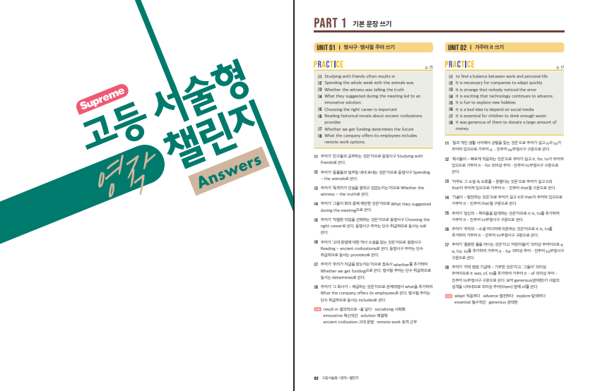 가장 눈에 띄는 부분은 전국 고등학교 내신 시험지 800개를 분석해 ‘시험에 꼭 나오는 서술형 핵심 문장 80개’를 뽑아 넣었다는 점입니다. 서술형은 범위를 넓게 잡으면 공부가 산만해지기 쉬운데, 출제 빈도가 높은 문장을 중심으로 잡아 주면 공부 방향이 선명해집니다. 그래서 시간이 부족한 상황에서도 일단 이 문장들은 정확히 쓰자라는 기준이 생기고, 그 기준이 곧 점수로 이어지기 쉽습니다. 아래 링크를 통해 supreme 고등 서술형 영작 챌린지 답지를 열람할 수 있습니다.