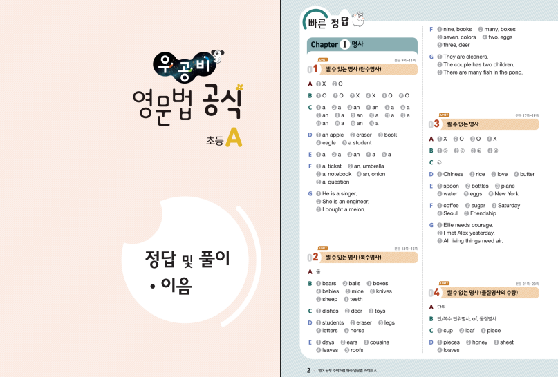 이 책의 학습 시스템은 [개념 학습 → 확인 학습 → 문장 훈련 → 실전 문제]로 이어집니다. 먼저 핵심 개념을 도식으로 정리해 원리를 잡고, 짧은 체크 문제로 이해를 점검합니다. 이어서 모델 문장을 바탕으로 말하기·쓰기 훈련을 하며, 마지막에는 학교 시험과 유사한 실전 문항으로 마무리합니다. 각 단계의 해설은 옆에서 코치를 받는 듯 친절하고, 헷갈리기 쉬운 포인트에는 ‘왜 그런지’를 짚는 설명이 붙어 있어 혼자서도 막힘없이 진도 나가도록 돕습니다. 아래 링크를 통해 우공비 영문법 초등 A 답지를 열람할 수 있습니다.