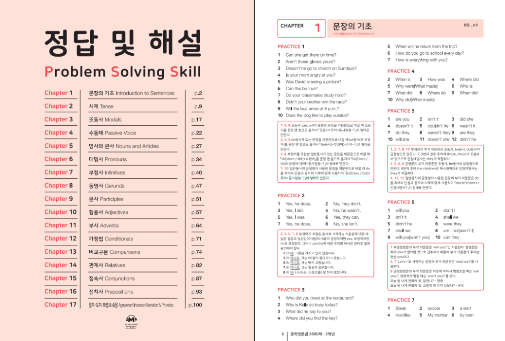 가장 큰 강점은 PSS(Problem Solving Skill) 설계입니다. 한 번에 한 가지 유형 스킬만 집중→즉시 유사 문항 반복→누적 복습의 루틴으로 오개념을 빠르게 교정합니다. 단답형·선택형·문장완성형·서술형 3,000문항에 더해 중간·기말 대비 800문항이 별도로 제공되어, 개념 확인→변형→실전의 난도 곡선이 자연스럽습니다. 학교 기출을 면밀히 분석해 채점 포인트(수일치, 시제·수동 결합, 대명사 격·수, 비교급·최상급 규칙 등)도 단계별로 체화할 수 있습니다. 아래 링크를 통해 마더텅 중학영문법 3800제 2학년 답지를 열람할 수 있습니다.