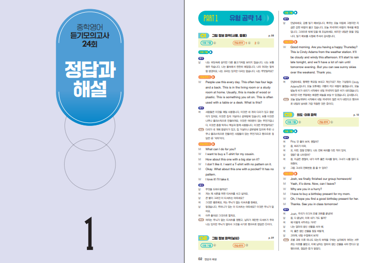 이 교재의 가장 큰 특징은 시·도교육청 듣기평가 기출 유형을 충실하게 반영했다는 점입니다. 그림 정보 파악, 의도와 이유 추론, 특정 정보 찾기 등 학교 시험에서 자주 나오는 유형을 먼저 연습한 뒤 실전 모의고사로 넘어가게 구성되어 있습니다. 문제 순서와 흐름도 실제 시험과 유사해 반복해서 풀다 보면 듣기 문제에 대한 긴장감이 줄어들고 문제 접근 속도도 빨라집니다. 아래 링크를 통해 중학 영어 듣기 레벨1 답지를 열람할 수 있습니다.