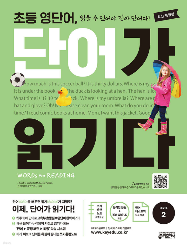 아이들이 단어책을 오래 못 가는 이유는 재미가 없어서라기보다, 외운 게 바로 써먹히는 느낌이 약하기 때문입니다. LEVEL 2는 문장이 생활 표현으로 확 넓어지면서, 오늘 배운 표현을 바로 말하거나 쓰는 느낌이 생겨서 유지가 더 쉬운 편입니다. 꾸준히만 하면 체감이 분명하고, 학교 영어에서도 문장 읽는 속도가 올라가는 편이라 만족도가 높습니다. 학습자료나 개정 요소가 들어가는 경우가 있으니 매년 개정되므로 표지 확인은 꼭 하시길 바랍니다. 본문에 단어가 읽기다2 답지 pdf 첨부해 두었으니 복습할 때 반복해서 활용하시길 바랍니다.