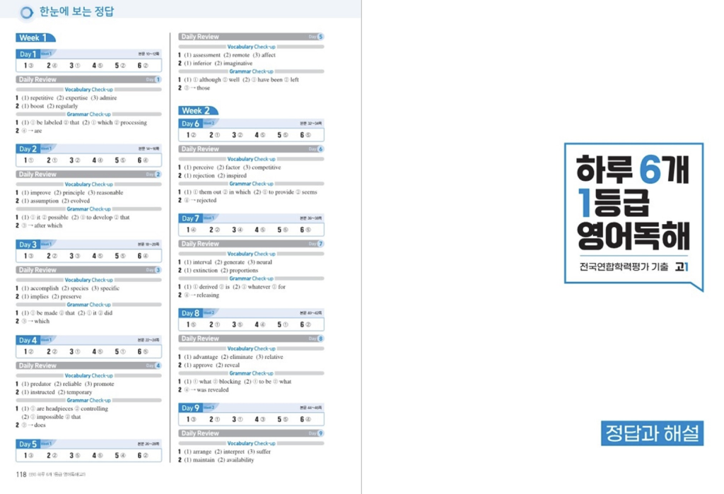 위 링크를 통해 하루 6개 1등급 영어독해 고1 답지를 볼 수 있습니다. 문제풀이 후 제공되는 해설 역시 매우 꼼꼼하게 정리되어 있습니다. 단순히 정답만 알려주는 것이 아니라, 각 선지가 왜 맞고 틀리는지를 자세히 설명해 주며, 매력적인 오답 선지에 대한 분석도 함께 수록되어 있어 실수를 줄이는 데 큰 도움이 됩니다. 또한 지문 분석과 어휘 풀이도 함께 실려 있어 독해 능력 전반을 끌어올릴 수 있습니다. 단기간에 실력을 올리고 싶은 학생뿐 아니라, 영어에 어려움을 느끼는 학생들에게도 기본기 다지기로 활용할 수 있습니다.
