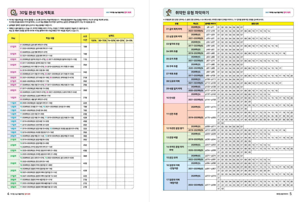 이 교재는 최신 5개년 수능과 모의평가 전 문항을 포함하고, 학력평가 및 경찰대·사관학교 기출문제 중 우수 문항을 선별하여 총 600문항 이상을 수록하고 있습니다. 글의 목적, 주제, 요지, 빈칸 추론, 문장 배열 등 수능 독해의 핵심 유형을 체계적으로 정리하여 학습할 수 있도록 구성되어 있으며, 30일 완성 학습 구조로 설계되어 있어 단계적으로 실력을 끌어올릴 수 있습니다. 또한 필수 어휘 2200개를 정리한 워드북까지 제공되어 독해와 어휘 학습을 동시에 진행할 수 있습니다.