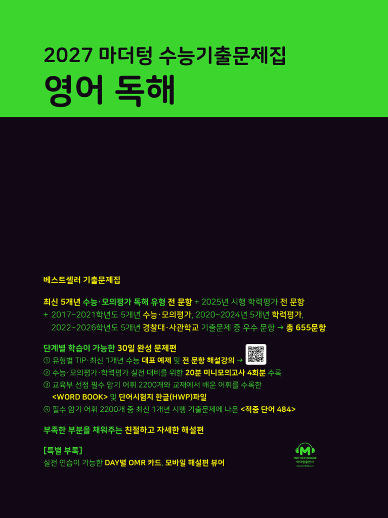 2027 마더텅 수능기출문제집 영어 독해 (2026년)은 수능 영어 독해 영역을 체계적으로 대비할 수 있도록 구성된 실전 대비 기출문제집입니다. 영어 독해는 지문 이해와 함께 문제 유형에 대한 적응력이 중요한 영역인데, 이 교재는 최신 기출문제를 중심으로 반복 학습이 가능하도록 설계되어 있어 수능 대비를 본격적으로 준비하는 학생에게 적합합니다. 아래에 마더텅 까만책 영어 독해 답지를 올려두도록 하겠습니다. 매년 바뀌므로 표지를 꼭 확인하시길 바랍니다.