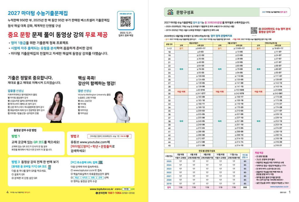 2027 마더텅 수능기출문제집 영어 듣기 (2026년)은 수능 영어 듣기 영역을 체계적으로 대비할 수 있도록 구성된 실전 대비 기출문제집입니다. 영어 듣기는 꾸준한 반복과 실전 감각이 중요한 영역인데, 이 교재는 최신 기출문제를 중심으로 회차별 학습이 가능하도록 설계되어 있어 수능 대비를 본격적으로 준비하는 학생에게 적합합니다. 아래에 마더텅 까만책 영어 듣기 답지를 올려두도록 하겠습니다. 매년 바뀌므로 표지를 꼭 확인하시길 바랍니다.