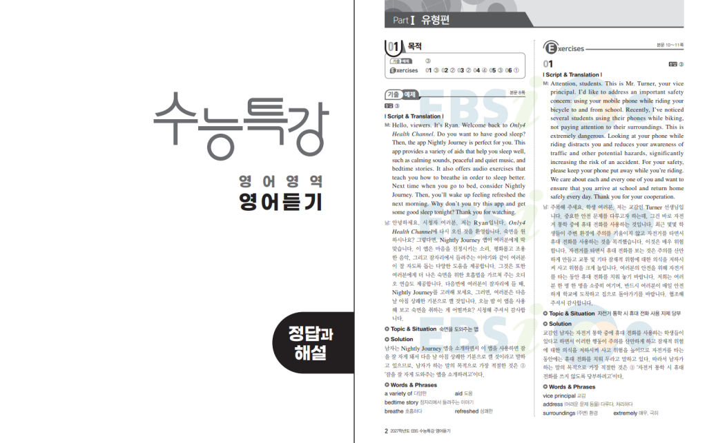 EBS 수능특강 영어영역 영어듣기 (2026년)는 수능 영어에서 듣기 점수를 안정적으로 챙기고 싶은 학생에게 딱 맞는 연계교재입니다. 수능 영어는 독해가 중심처럼 보이지만, 듣기는 정해진 시간 안에 실수 없이 맞혀야 해서 오히려 더 긴장되는 파트입니다. 이 책은 그런 부담을 줄이기 위해 자주 나오는 상황과 표현을 유형별로 정리해 두고, 실전처럼 연습할 수 있게 구성되어 있습니다. 그리고 수특 시리즈는 매년 표지가 바뀌는 것으로도 유명해서, 표지만 봐도 그 해 수험 분위기가 떠오를 정도로 상징성이 큰 편입니다. 아래 수특 영어듣기 답지 pdf 올려두겠습니다.
