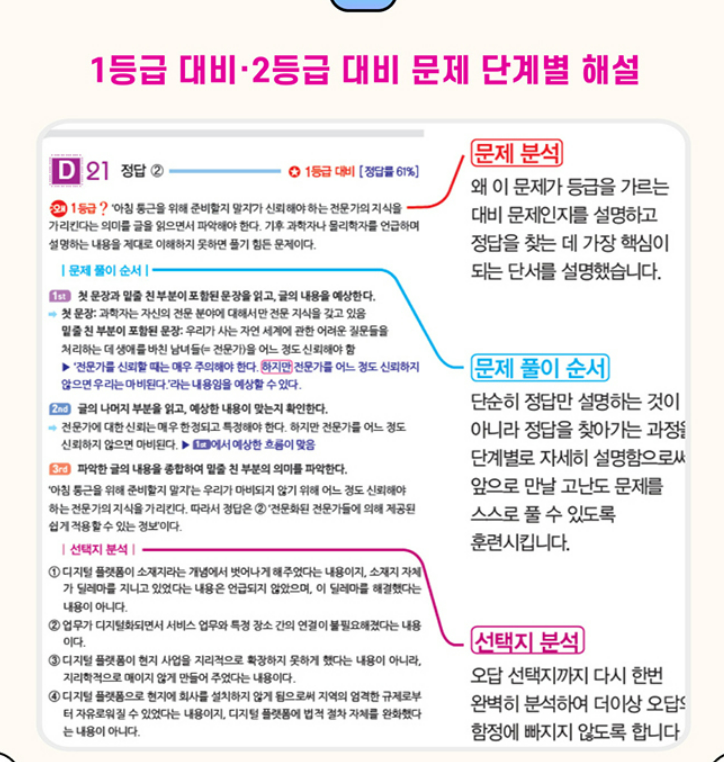 공부할 때는 한 유형을 시작하면 그 유형에서 자주 쓰는 단서부터 습관처럼 잡는 연습이 필요합니다. 예를 들어 목적이나 요지는 첫 문장만 보고 결정하지 말고, 반복되는 단어와 대조 표현을 확인하는 식으로 근거를 쌓아야 실수가 줄어듭니다. 빈칸과 순서 문제는 접속사나 대명사 같은 연결고리를 먼저 표시해 두면, 지문이 길어도 길을 잃지 않습니다. 이 책은 1등급과 2등급을 가르는 고난도 문항을 따로 표시해 두어서, 기본을 다진 다음 단계로 넘어가기도 편합니다.