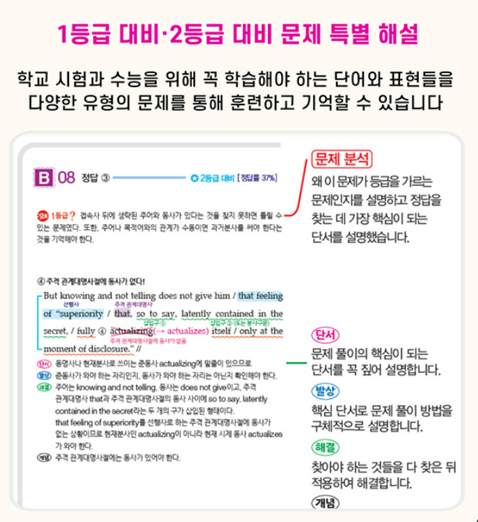 어법 파트는 문장의 구성 요소부터 도치와 병렬까지 수능에 반복 출제되는 개념을 촘촘하게 정리합니다. 주어와 동사의 수 일치, 시제, 수동태, 가정법처럼 자주 틀리는 부분을 유형별로 나누어 기출을 난이도 순으로 배치해 두었습니다. 그래서 개념을 확인하고 바로 기출 문제를 풀면서 이 개념이 이렇게 문제화되는구나를 자연스럽게 체득하게 됩니다. 해설은 정답 근거뿐 아니라 오답이 왜 틀렸는지까지 짚어 주어서, 한 문제를 풀어도 제대로 정리되는 구조입니다. 아래 링크를 통해 자이스토리 어법어휘 실전 답지를 열람할 수 있습니다.