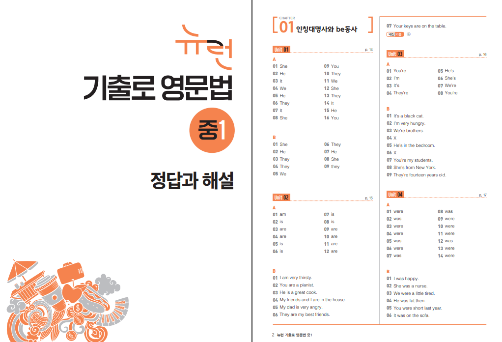 이 교재는 인칭대명사와 be동사부터 일반동사, 시제, 조동사, 명사와 관사, 형용사와 부사, 의문문, 문장 형식, to부정사와 동명사, 전치사, 접속사까지 중1 영문법 전 범위를 체계적으로 다루고 있습니다. 각 단원은 세분화된 유닛으로 구성되어 있어 개념을 단계적으로 이해할 수 있으며, 실제 시험에 자주 출제되는 유형을 중심으로 구성되어 있어 실전 대비에 도움이 됩니다. 아래 링크로 기출로 영문법 중1 답지 열람이 가능합니다.