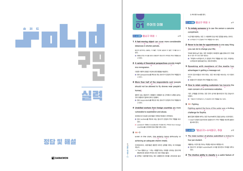 공부할 때는 한 문장을 보면 먼저 동사를 찾고, 그 동사가 요구하는 자리(목적어가 필요한지, 보어가 붙는지)를 확인한 다음, 수식어구와 절을 뒤에서 붙이는 방식으로 읽는 연습을 하는 것이 좋습니다. 이 책은 특히 수동태, 준동사, 관계사절, 분사구문, 병렬·도치 같은 파트에서 실수가 많이 나는데, 그 부분만 따로 반복하면 점수 변화가 잘 보입니다. 기본을 끝냈거나 기본으로 문장 뼈대는 잡히는데 실전에서 정확도가 떨어진다면, ‘구문 실력’이 다음 단계로 자연스럽게 이어지는 선택입니다. 본문에 solid 솔리드 구문 실력편 답지 pdf 파일을 첨부해두었습니다.