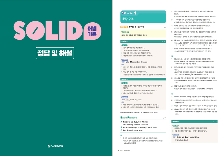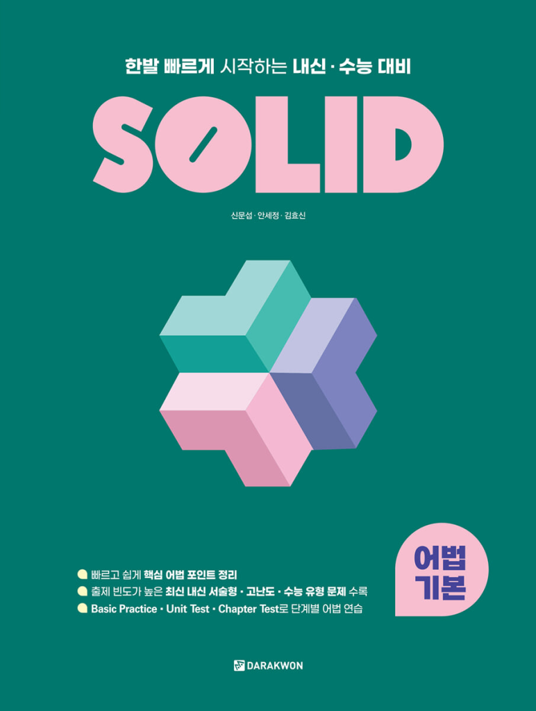 내신 대비라면 학교 시험 범위에 맞춰 해당 챕터를 먼저 끝내고, Unit Test나 Chapter Test에서 틀린 유형만 다시 모아 반복하는 식으로 운영하는 것이 좋습니다. 수능 대비라면 기본 어법을 빨리 안정시키는 용도로 쓰고, 이후에는 더 많은 지문형 문제로 확장해 가면 흐름이 자연스럽습니다. 같은 SOLID 시리즈에 필수 영문법, 구문 교재도 함께 있는 만큼, 문장 구조가 흔들리면 구문 쪽으로 보완하고 어법은 이 책으로 정확도를 올리는 방식으로 병행하면 안정감이 생깁니다. 본문에 solid 어법 기본 답지 pdf 파일을 본문에 첨부해두었습니다.