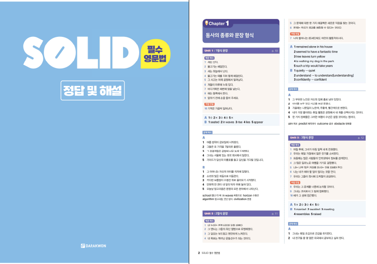 구성은 문장 형식부터 시작해 시제, 수동태, to부정사, 동명사, 분사, 조동사, 가정법, 명사·관사·대명사, 형용사·부사, 비교, 전치사, 접속사, 관계사, 특수 구문까지 큰 흐름으로 이어집니다. 문법을 단원별로 쪼개서 배우되, 중간중간 누적 테스트가 들어가 있어 앞에서 배운 내용을 잊지 않게 다시 묶어 점검할 수 있게 되어 있습니다. 특히 내신에서 자주 나오는 서술형이나 고난도 유형, 수능형 문제까지 포함한다고 안내되어 있어서, 개념만 정리한 문법책보다 실전 쪽에 더 가까운 편입니다. 아래 링크를 통해 솔리드 필수영문법 답지를 열람할 수 있습니다.