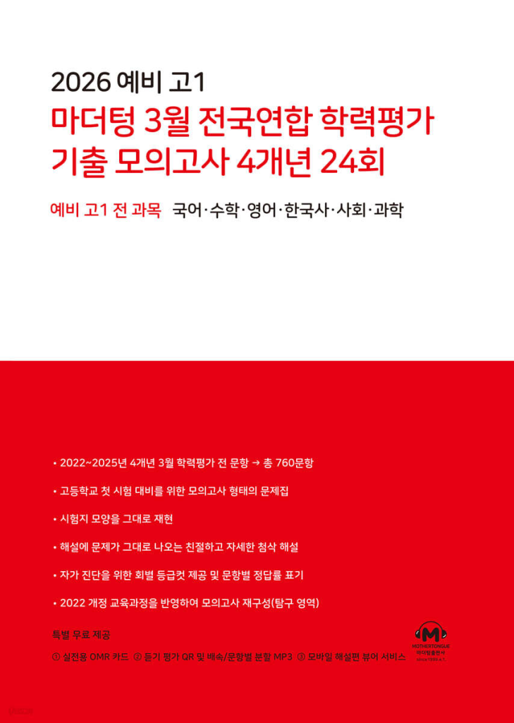 회차마다 등급컷이 제공되어 풀고 난 뒤 바로 자신의 위치를 가늠할 수 있습니다. 문항별 정답률이 표시되어 어떤 문제가 상대적으로 어려웠는지도 확인할 수 있고, 영어는 듣기 MP3를 QR로 스트리밍하거나 파일로 내려 받아 속도 조절과 문항별 구간 연습이 가능합니다. 탐구 영역은 2022 개정 교육과정에 맞춰 문항 수와 구성을 재정렬했기 때문에 고1 내신과 학평 사이에서 어색함이 줄어듭니다. OMR 카드가 들어 있어 제한 시간 안에 마킹하는 연습을 반복하면 실제 시험장에서의 손동작과 리듬을 미리 만들어 둘 수 있습니다. 아래 링크를 통해 2026 마더텅 예비고1 3월 모의고사 답지를 열람할 수 있습니다.